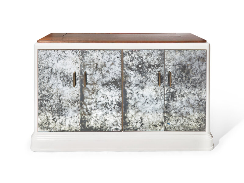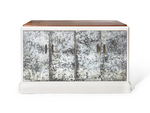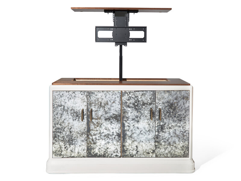 Custom designed antiqued mirror front cabinet by S.R. Gambrel featuring a hidden, mechanized TV lift. The piece showcases a sophisticated blend of materials and textures, with antiqued mirrored doors framed in a lacquered white case and accented by elegant bronze hardware. A rich walnut top adds warmth and contrast, highlighting Gambrel’s signature balance of modern luxury and timeless craftsmanship. The concealed lift mechanism allows for seamless functionality—raising or lowering a television at the touch of a button—making this cabinet as practical as it is sculptural. Perfect for refined living spaces where technology and design coexist beautifully.