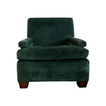 A custom Hickory Chair Furniture green mohair velvet MacDonald style club chair with a tailored, square shaped back and square front seat and low straight arms, filled with down cushions and sitting on square wood feet. A classic and tailored comfortable club chair, both modern and timeless.