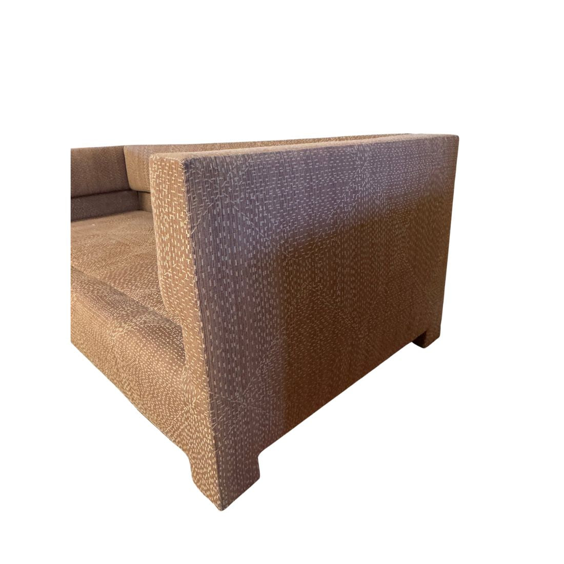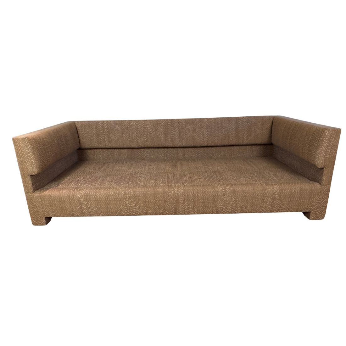 Custom upholstered sofa inspired by the clean-lined, mid-century modern designs of Milo Baughman. Upholstered in a mocha brown John Rosselli fabric featuring a refined small-scale geometric print, this piece balances tailored sophistication with inviting comfort. The streamlined silhouette, low profile, and precise proportions create a timeless statement suitable for both modern and transitional interiors. The sofa features three loose down back cushions and a single, tufted bench seat. A chic and comfortable focal point for living rooms, offices, or curated lounge spaces