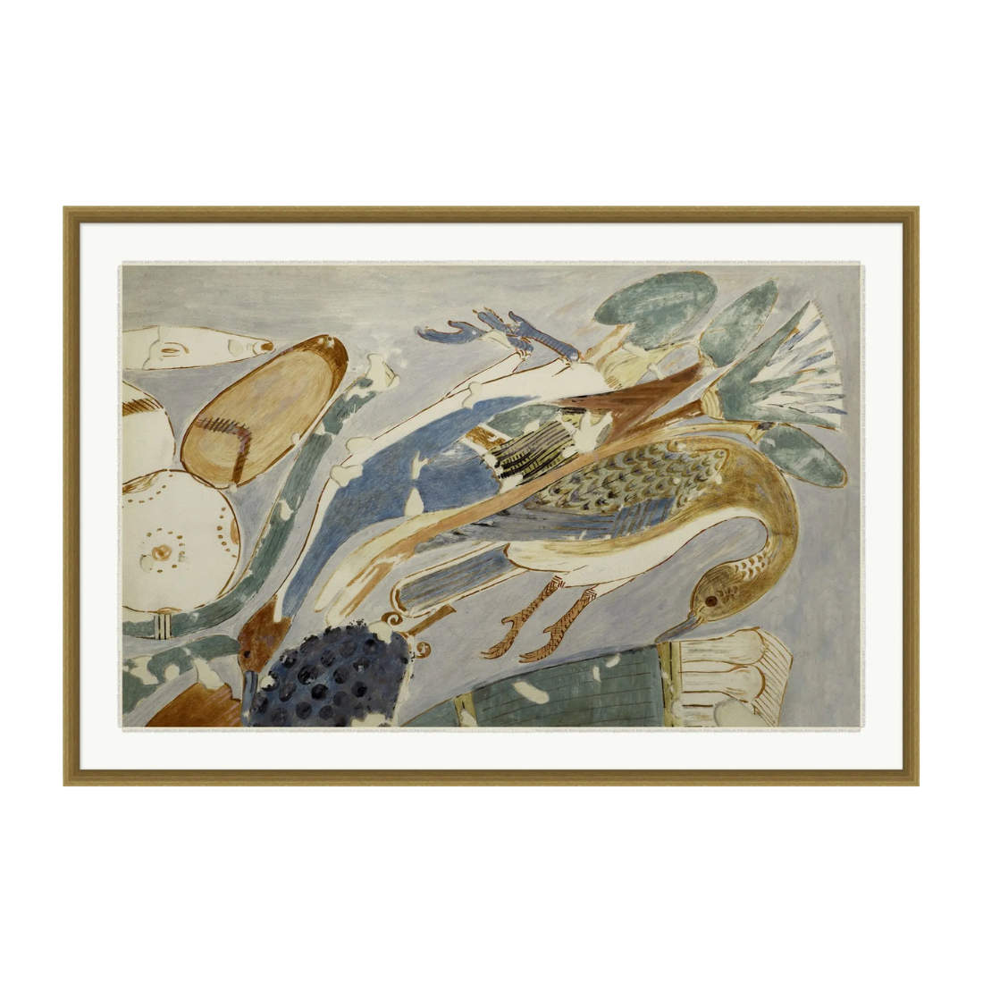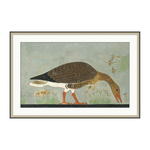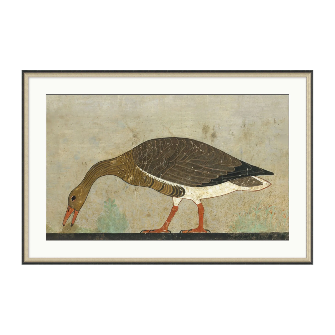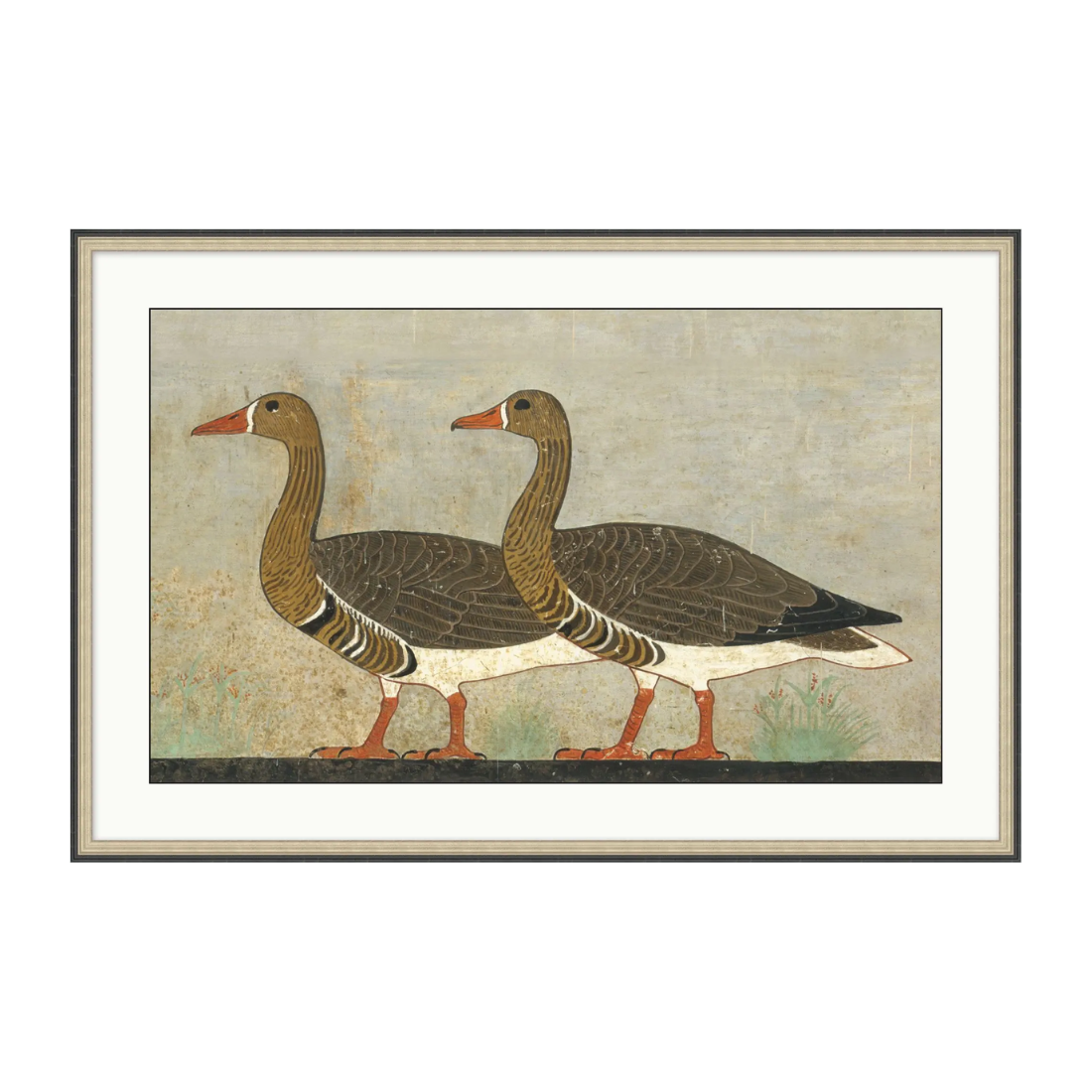 These framed artworks depict a beautifully detailed illustrations of geese, rendered in earthy tones of brown, white, and orange against a muted green background. Framed & matted print.
