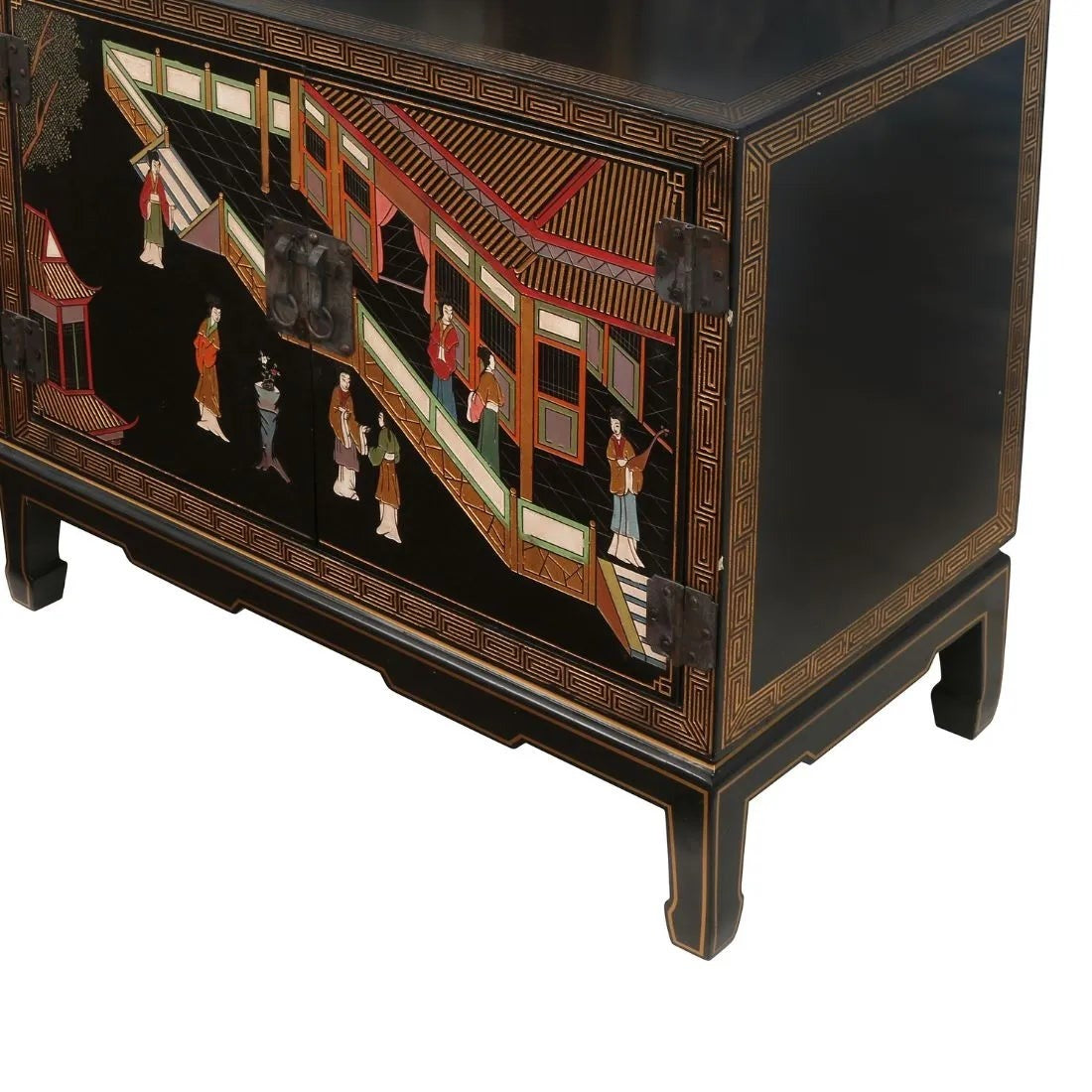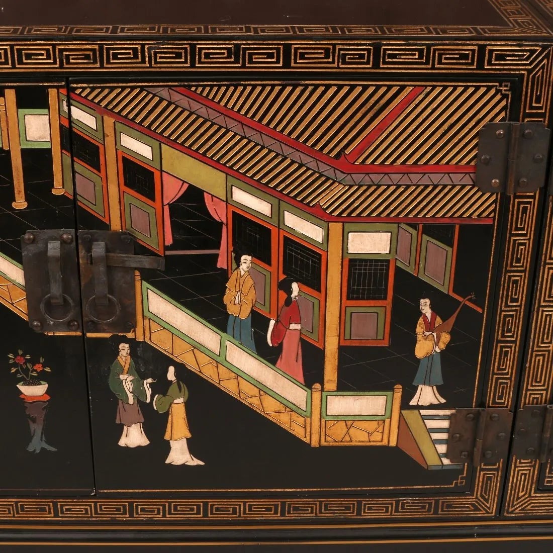 LARGE ASIAN HAND PAINTED CREDENZA WITH CARVED CHINOISERIE MOTIF
