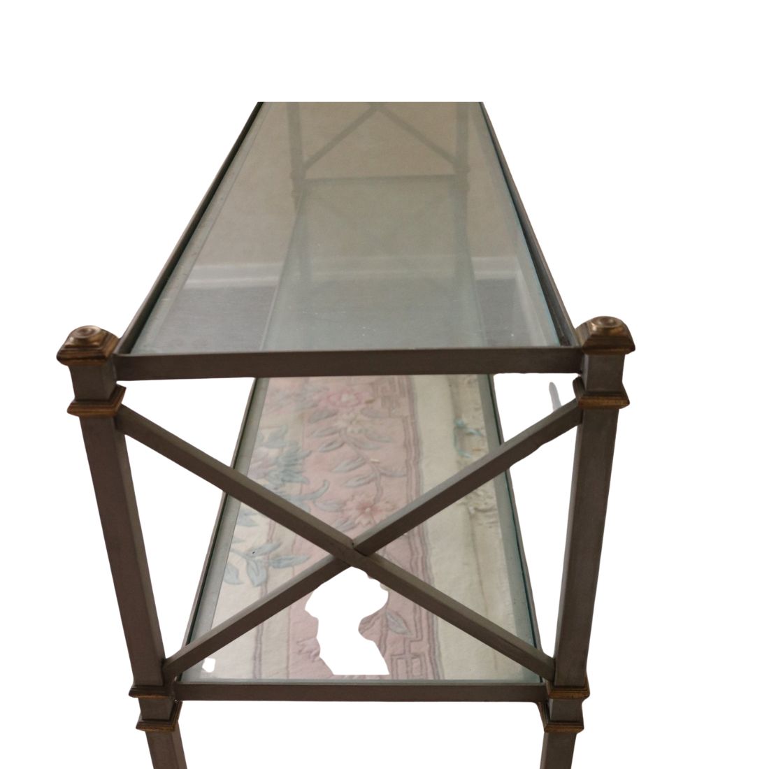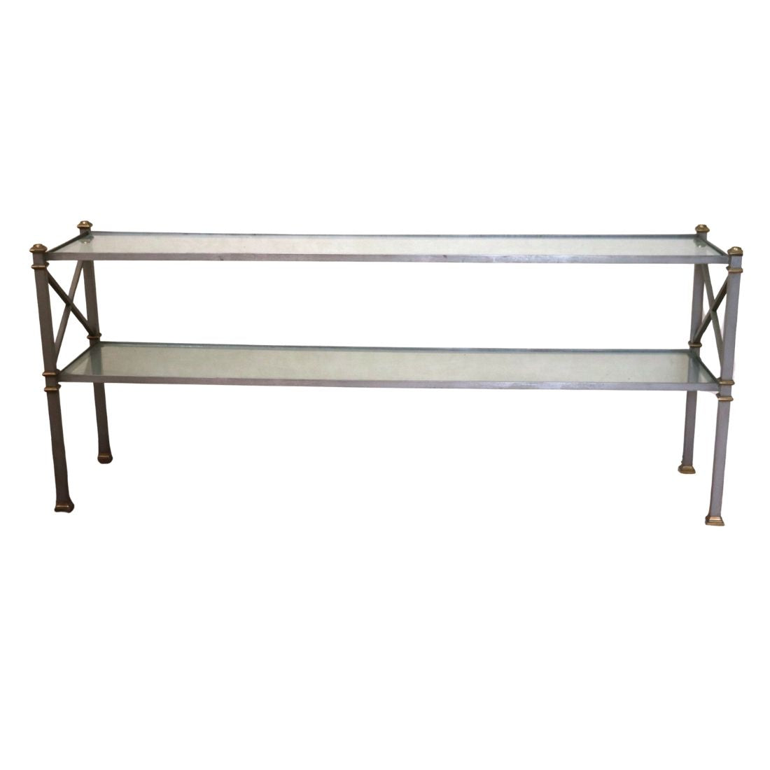 A two tier sleek metal and glass console table attributed to Maison Jansen, designed in the refined style of the celebrated Parisian design house. The piece features clean neoclassical lines and understated detailing defined by two tiers of inset glass shelves, rectangular legs accented with brass finials and feet, and cross braced side supports. The subtle pewter metallic tone and warm brass details pair beautifully with the transparency of the glass, creating a look that is airy yet substantial.