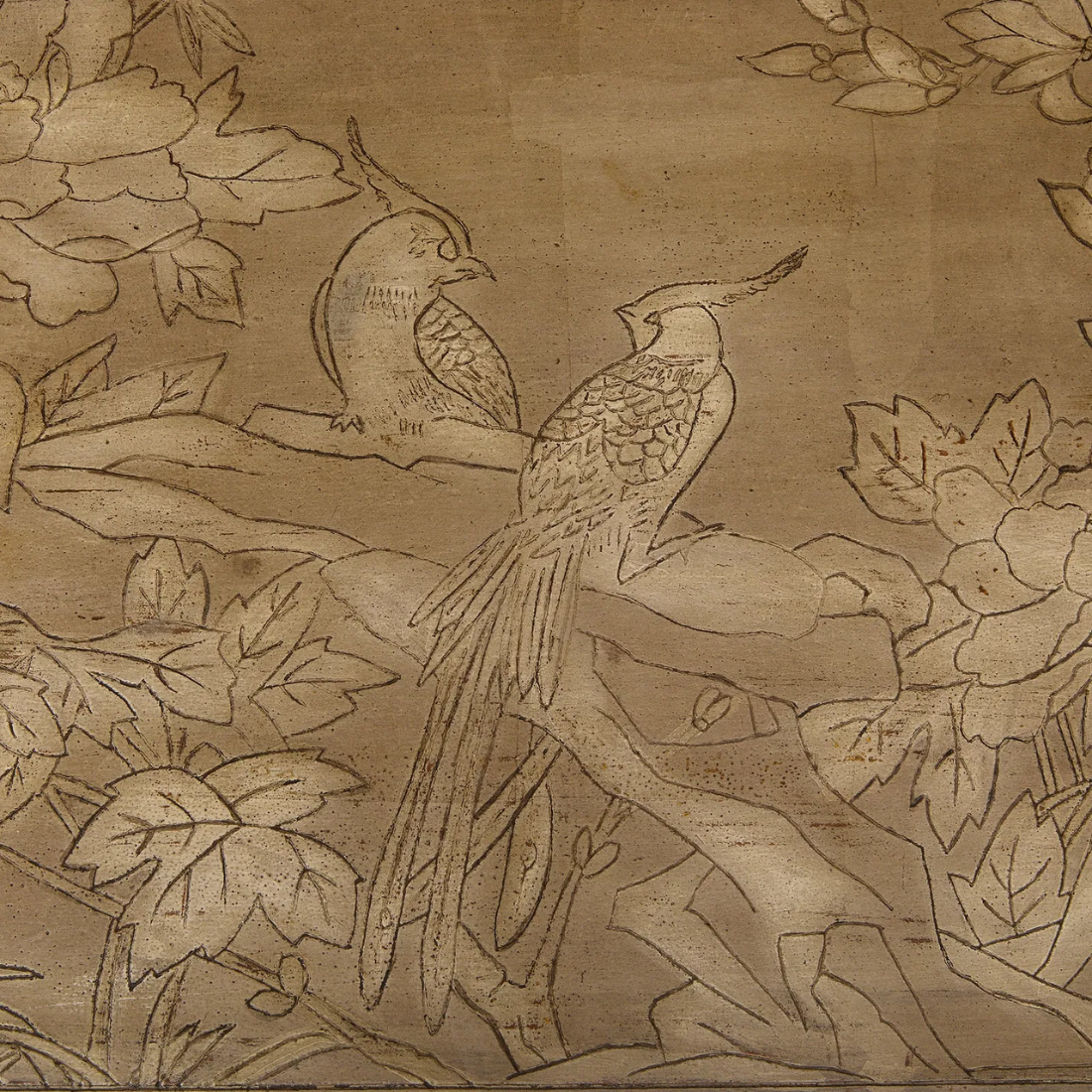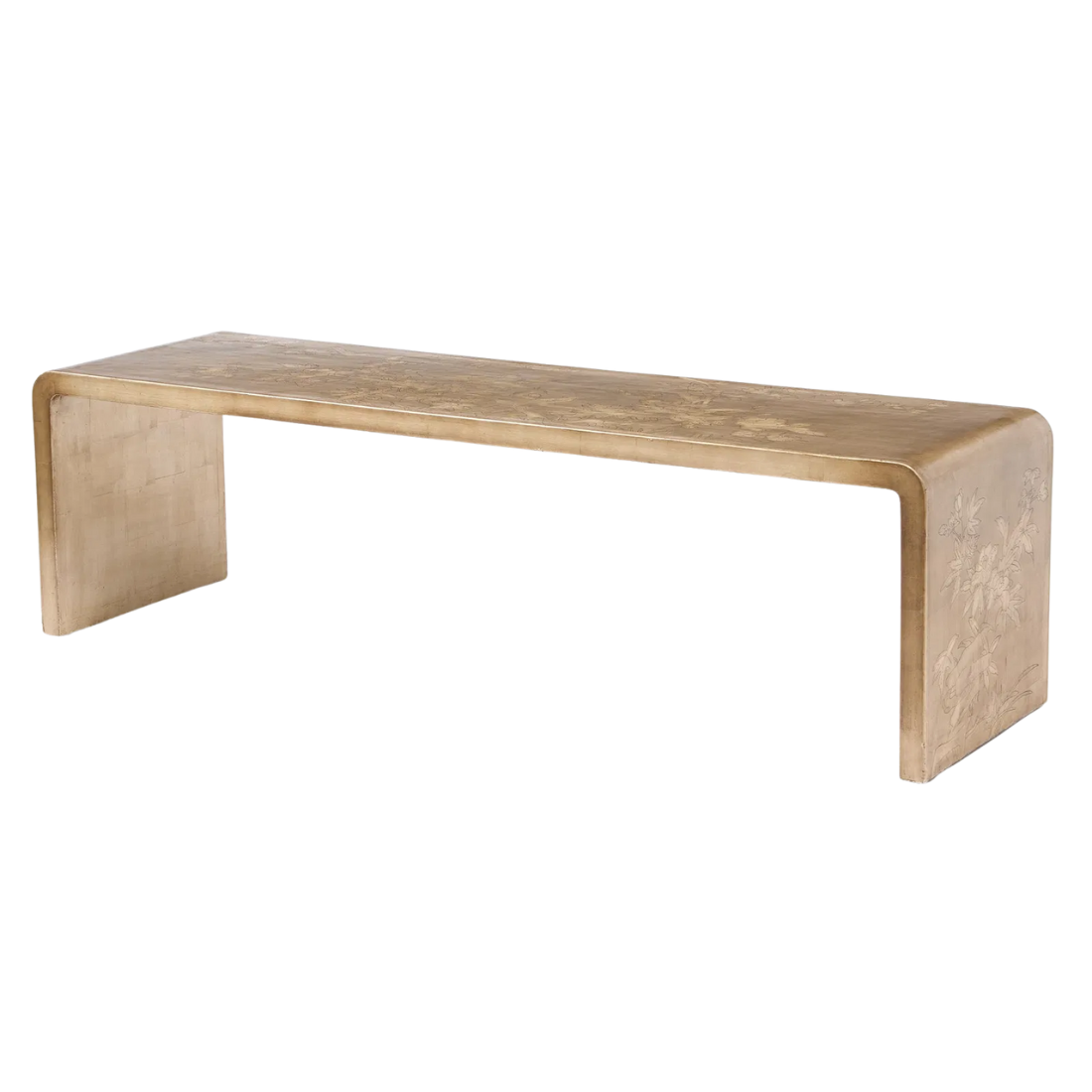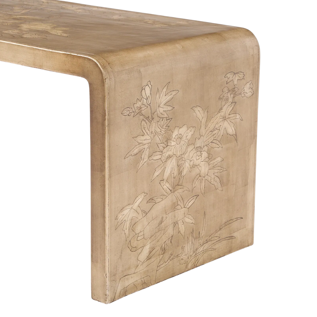 This elegant silver leaf low waterfall table features a smooth, continuous design that flows seamlessly from top to sides with delicately etched floral and bird motifs on the surface.