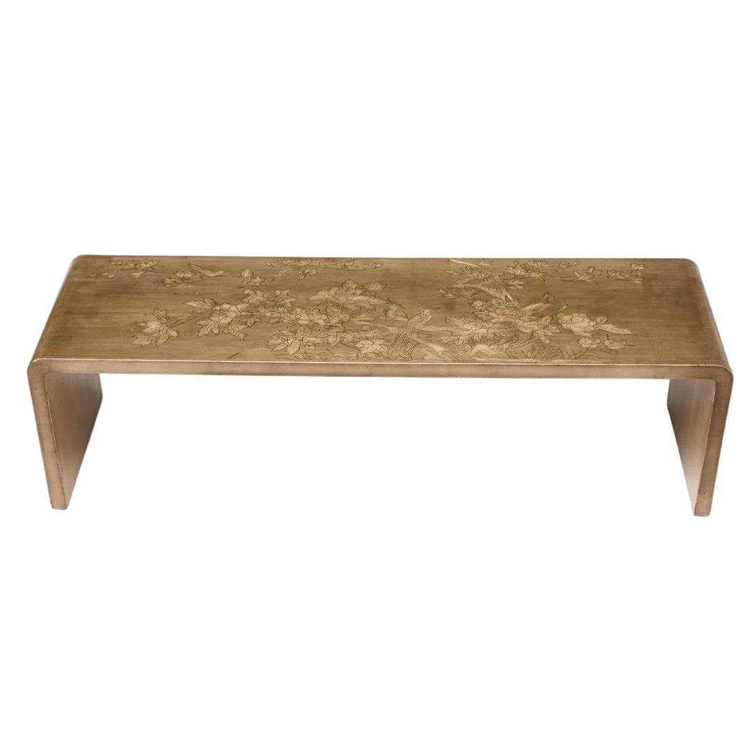 This elegant silver leaf low waterfall table features a smooth, continuous design that flows seamlessly from top to sides with delicately etched floral and bird motifs on the surface. Max Kuehne approached furniture as a canvas, using silver leaf, etched decoration and layered finishes to achieve depth, luminosity, and subtle narrative creating pieces that feel both timeless and quietly expressive.