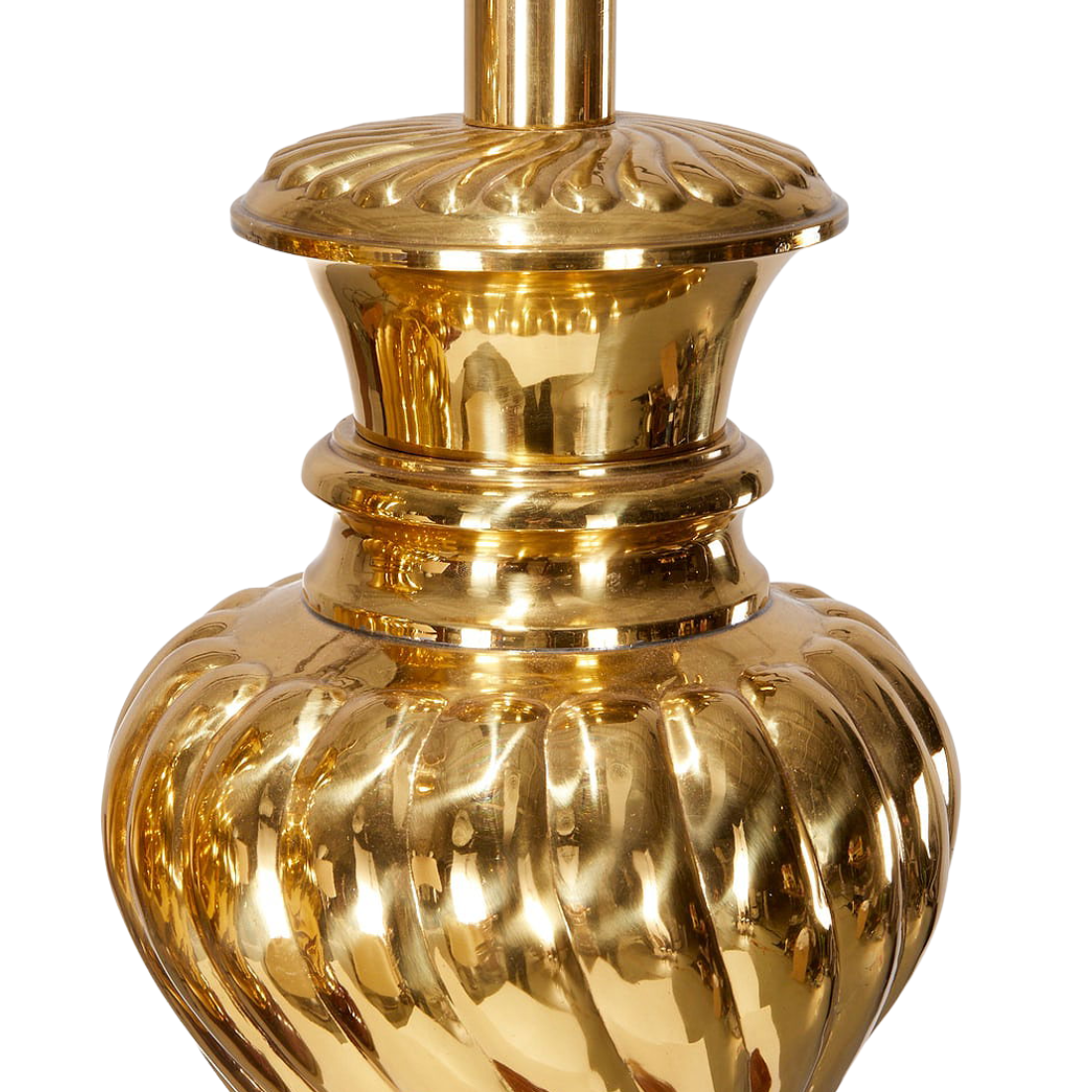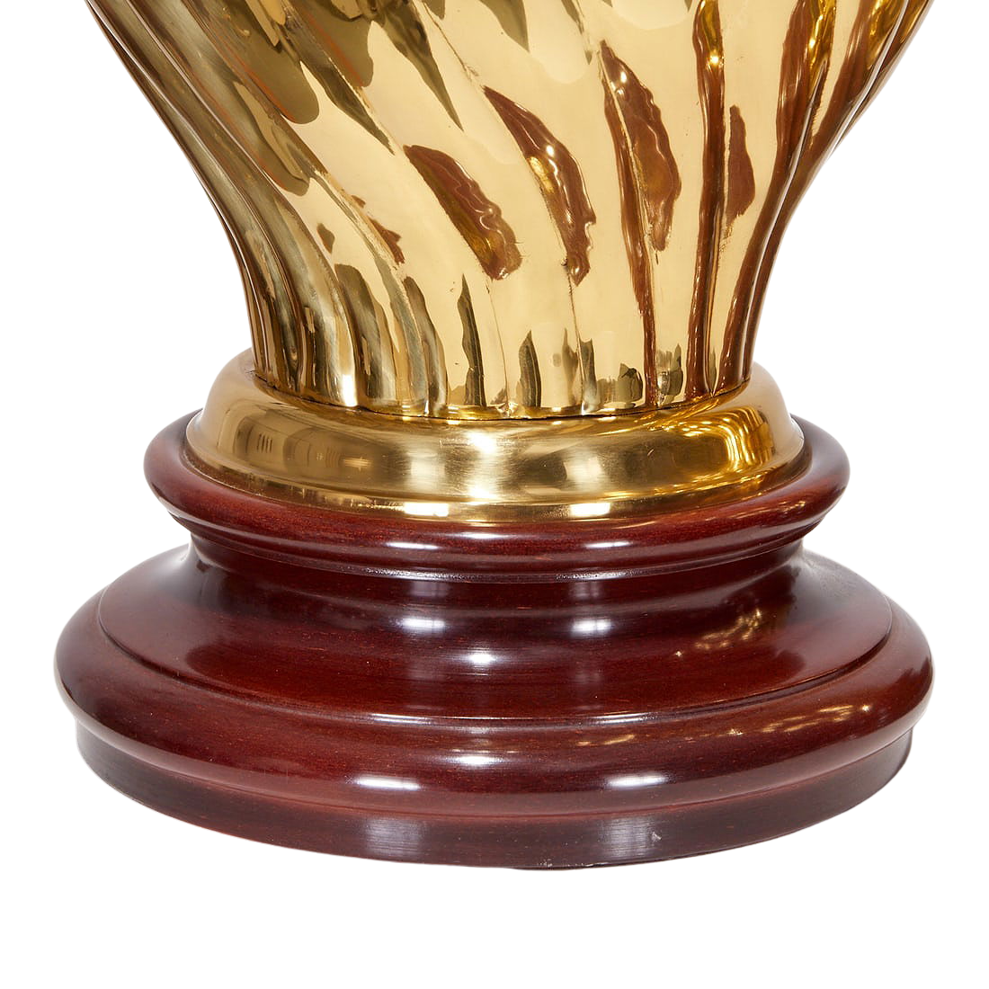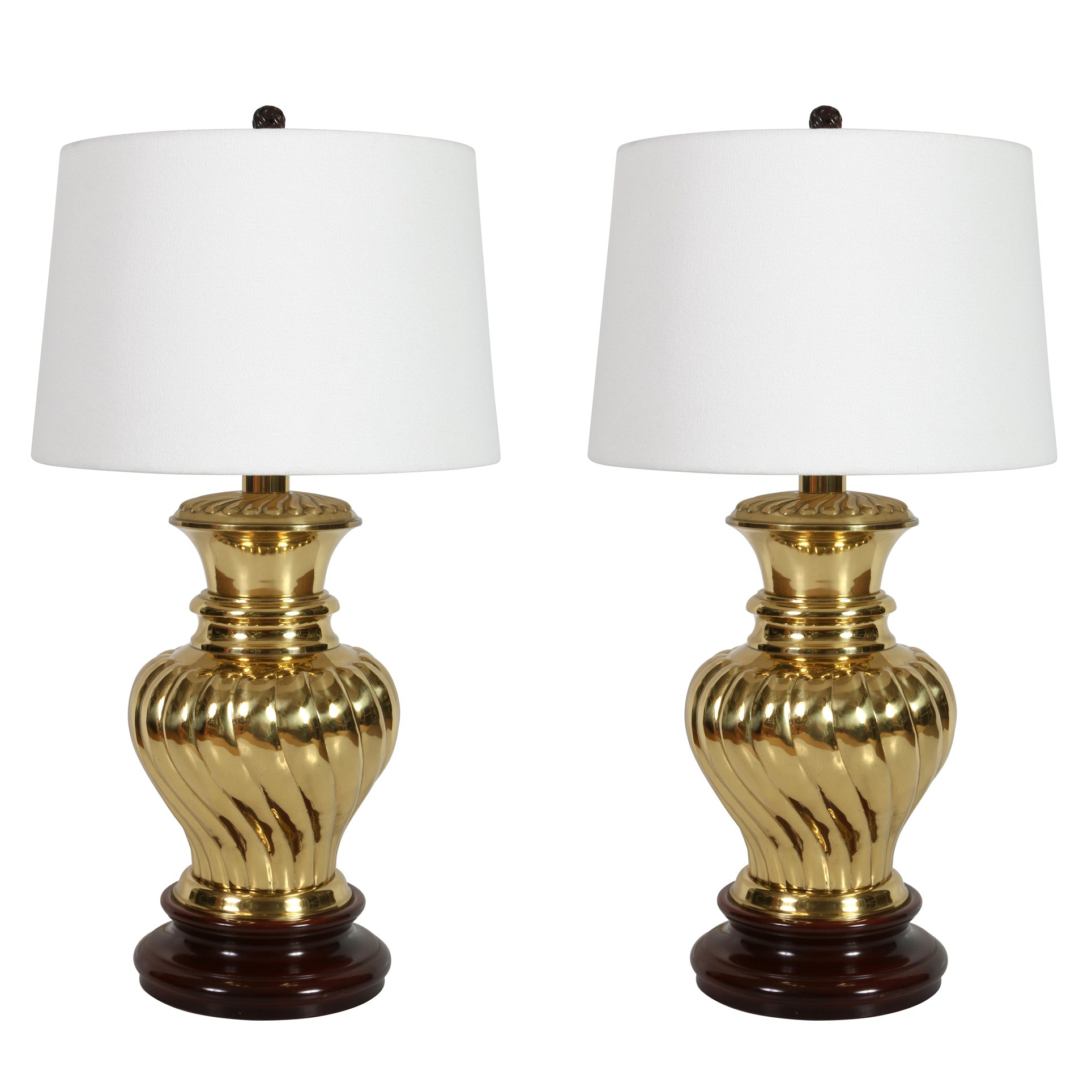 A vintage pair of Hollywood Regency style table lamps featuring a classic ginger jar inspired shape rendered in warm, high-shine brass and anchored by rich, dark wood plinth bases. The sculptural, ribbed form brings depth and visual interest, with their gleaming brass finish lending a sense of refinement and luxury. Equally at home in a traditional of updated interior, they work beautifully flanking a console, credenza, or nightstands.