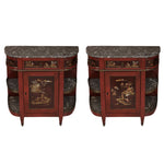 PAIR OF ANTIQUE DEMI LUNE SIDEBOARDS WITH MARBLE TOP, OPEN SHELVES AND CHINOISERIES DETAILS