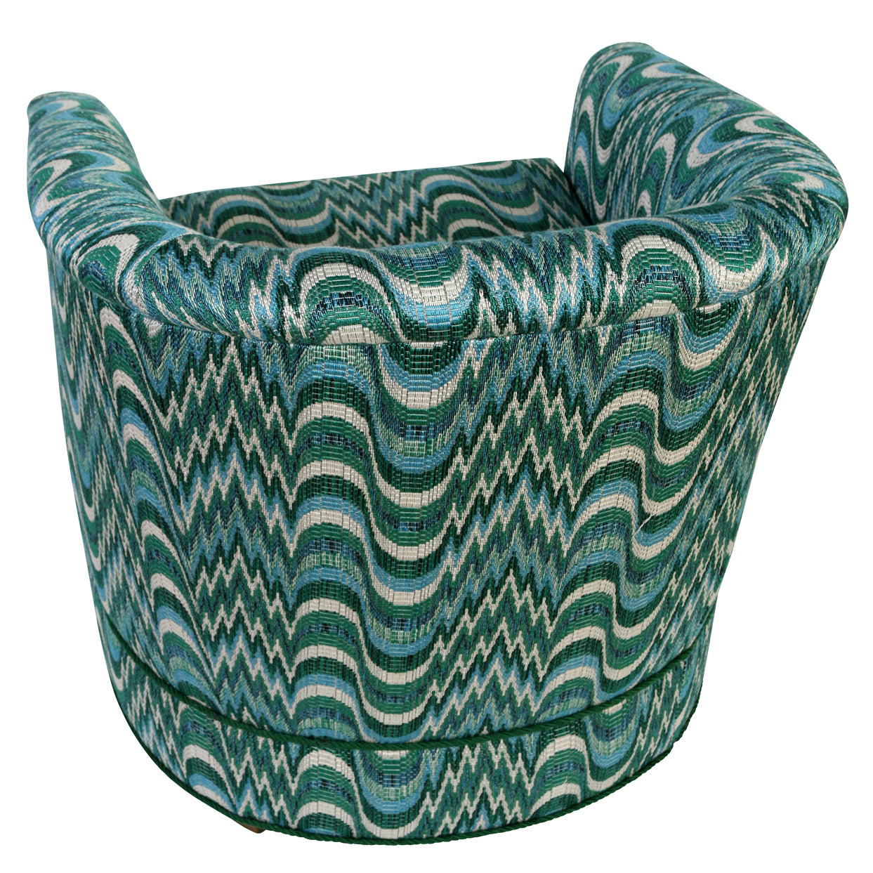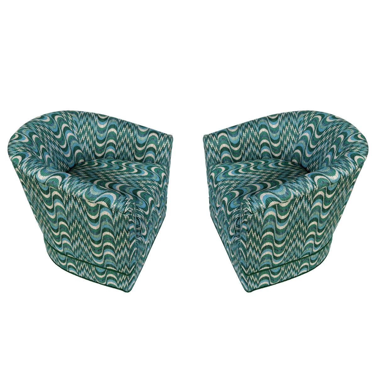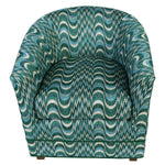 A pair of newly upholstered barrel chairs in a contoured silhouette with a rounded back and integrated arms. The tub chairs are fully upholstered in a richly textured Dedar fabric, showcasing a rhythmic zigzag and wave pattern in layered tones of teal, blue, green, and ivory. The dynamic pattern adds visual depth while maintaining a balanced, tailored appearance. Perfect for lounging or accent seating.