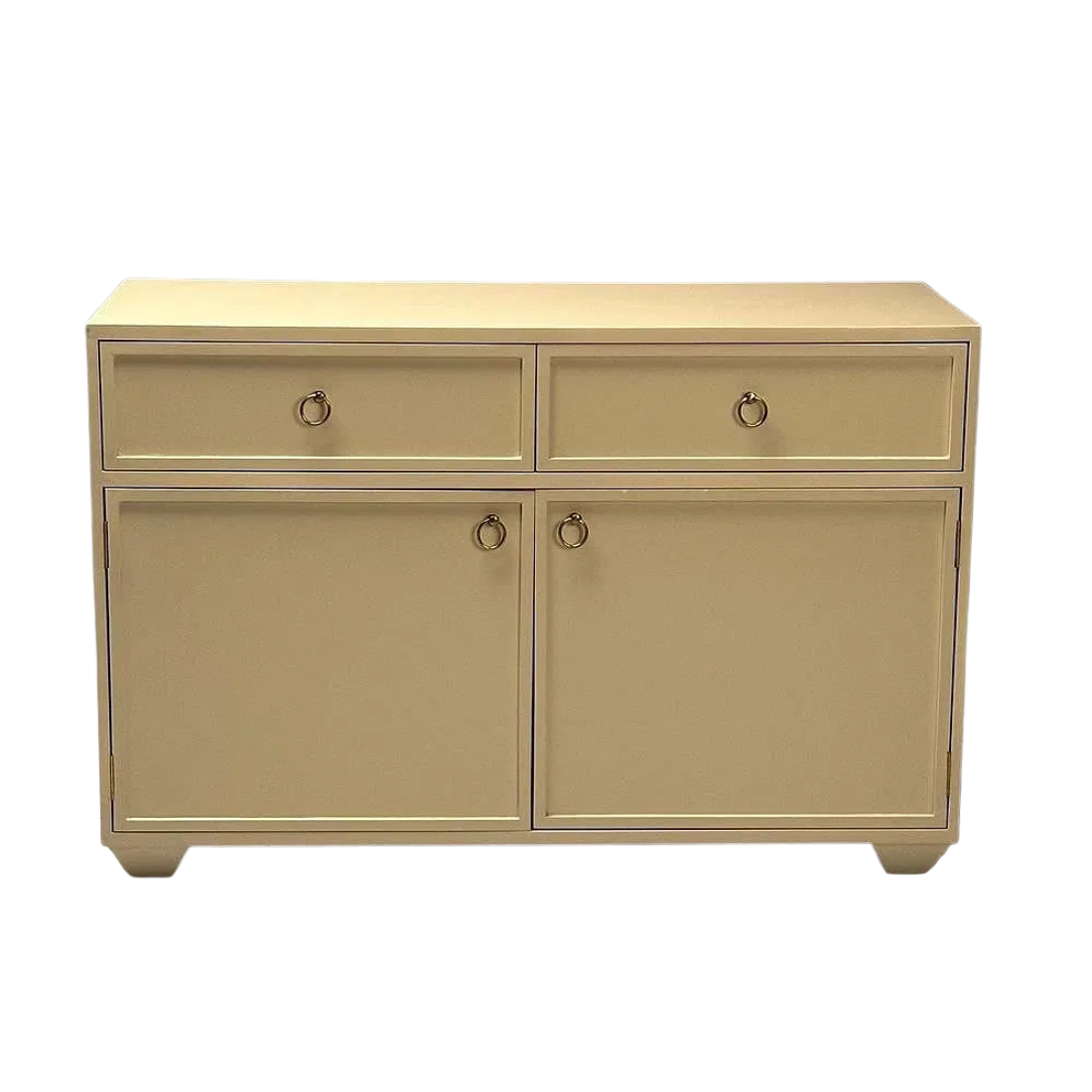 A refined and beautifully crafted pair of cream lacquer cabinets designed by Jack Fhillips and produced by EJ Victor. Each cabinet features a clean, tailored silhouette finished in a soft, hand‑applied cream lacquer. Brass ring details highlight the simple, clean design. Each cabinet has two drawers at top and below, a pair of double doors open to reveal a spacious shelved interior, offering generous and flexible storage. These cabinets embody the sophisticated simplicity and elevated craftsmanship associated with both Fhillips’ design sensibility and E.J. Victor’s production quality. Perfect as buffet cabinets, nightstands, or accent pieces.
