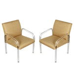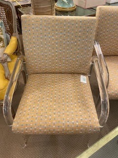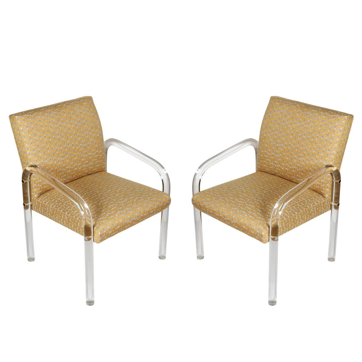 A vintage pair of Leon Frost for Pace Collection lucite arm chairs, newly upholstered in an ochre ground and french blue and white geometric patterned fabric. The transparent lucite frames create a sleek, modern silhouette that contrasts beautifully with the vivid, structured textile. A perfect balance of clarity and color, these chairs capture the sophisticated glamour of 1970s design—ideal for a contemporary interior, dressing area, or statement seating in a modern living space.