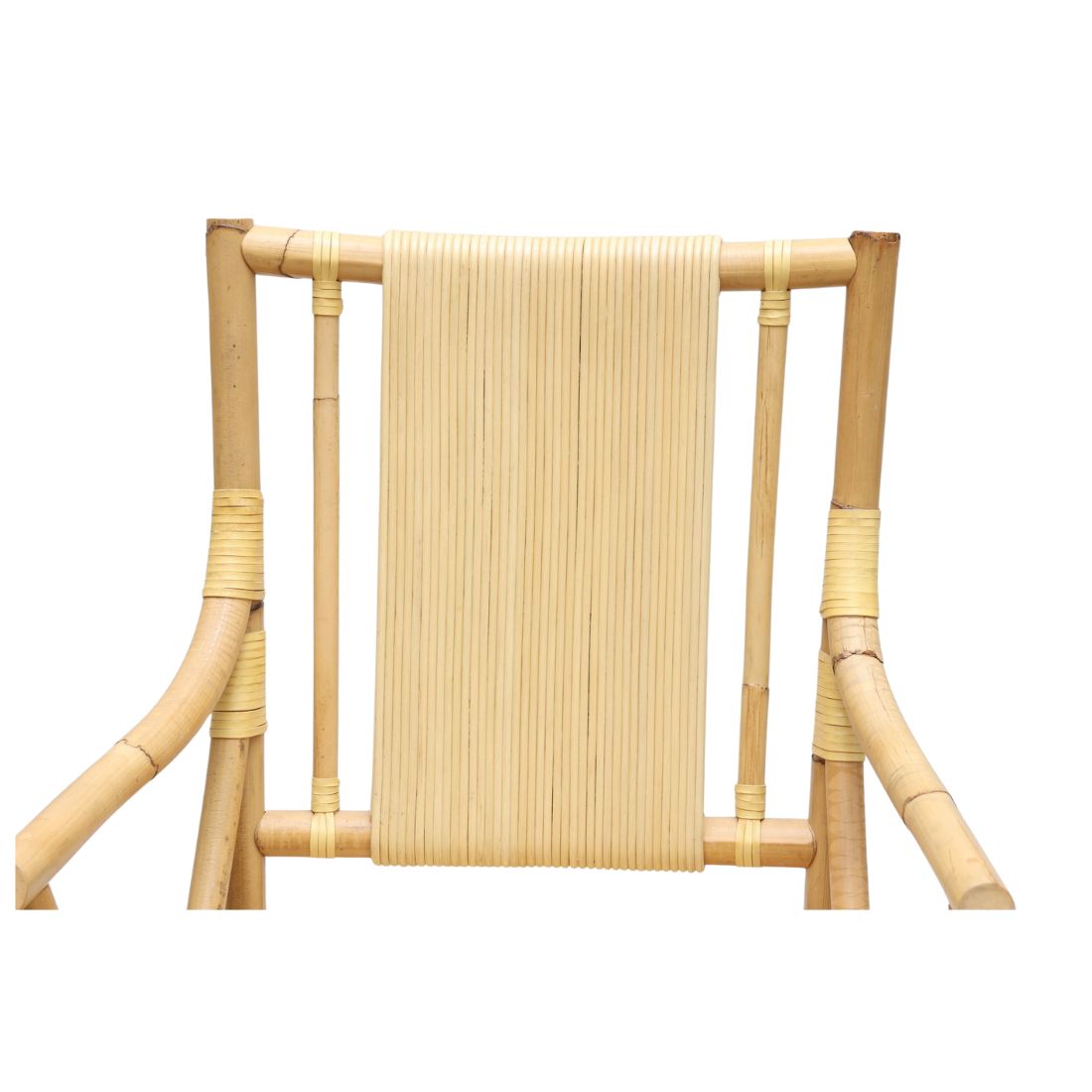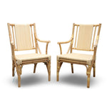 A vintage pair of chairs feature a handcrafted bamboo frame, articulated with gently curved arms. Subtle lashings at key joints reinforce both strength and visual rhythm, a hallmark of high-quality bamboo construction. The seat and back are tightly wrapped in natural reed, creating a continuous, textural surface that is both supportive and visually light. The vertical striations of the woven back introduce a tailored, architectural quality, while the generously proportioned seat maintains comfort without the need for upholstery.