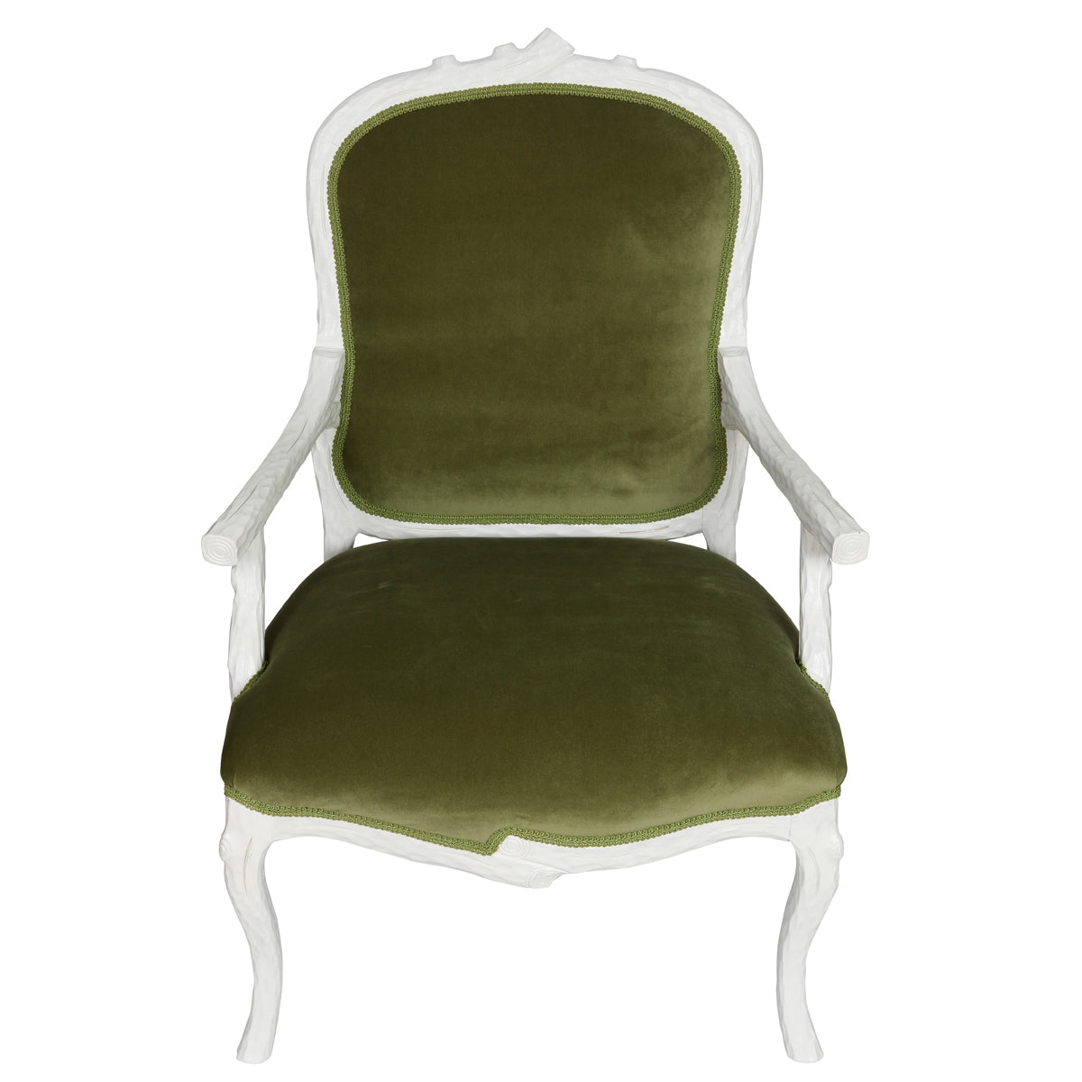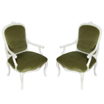 A pair of white painted faux bois designed armchairs featuring a graceful French shape with cabriole legs. Newly upholstered in rich green velvet on the seats and inside backs, and complemented by a soft blue floral blockprint fabric on the chair backs. The combination of textures and tones gives these chairs a refined yet whimsical appeal—perfect for adding a touch of French country elegance or Palm Beach chic to any living space.