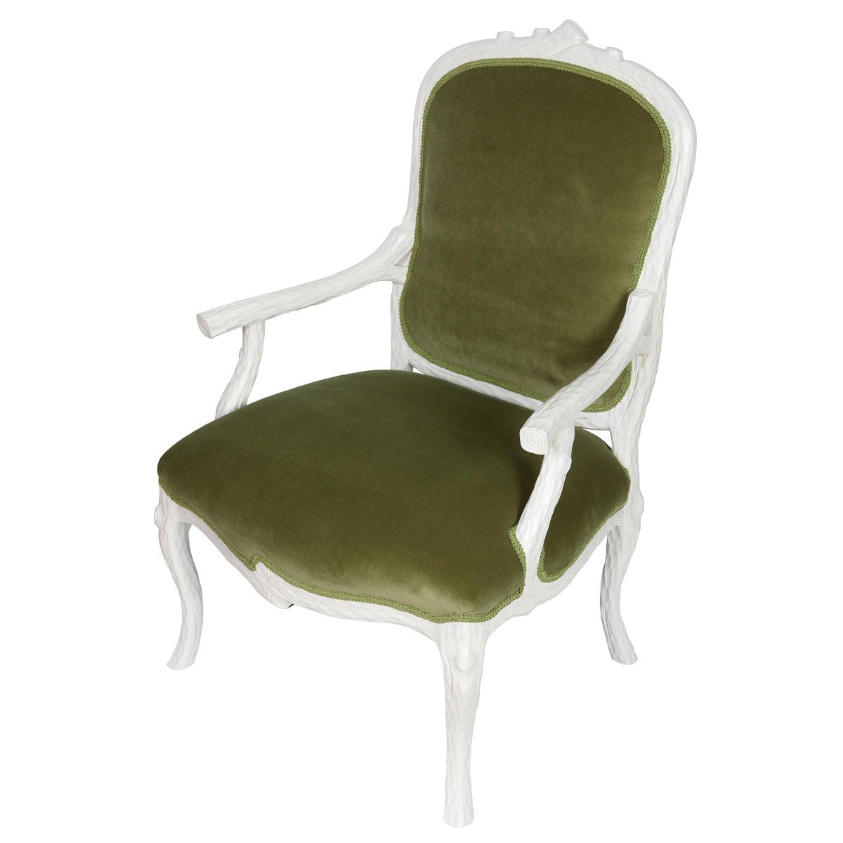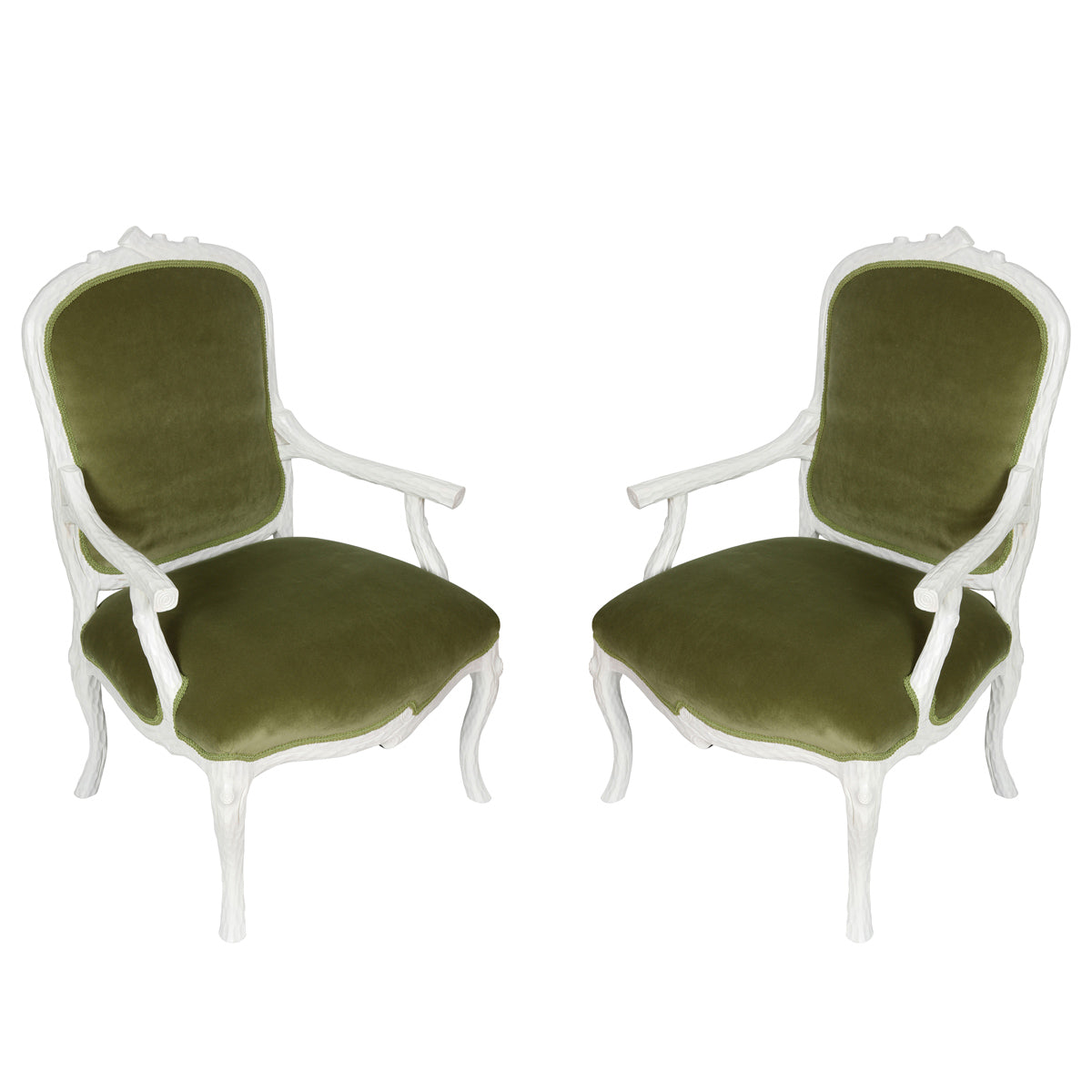 PAIR OF WHITE FAUX BOIS ARMCHAIRS WITH GREEN UPHOLSTERY