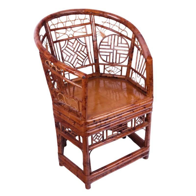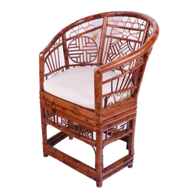A vintage rattan Brighton Pavilion chair with a loose cushion. The graceful horseshoe shape to the chair and intricate rattan design makes this chair quite special. A variety of open fretwork design circles the back of the chair.