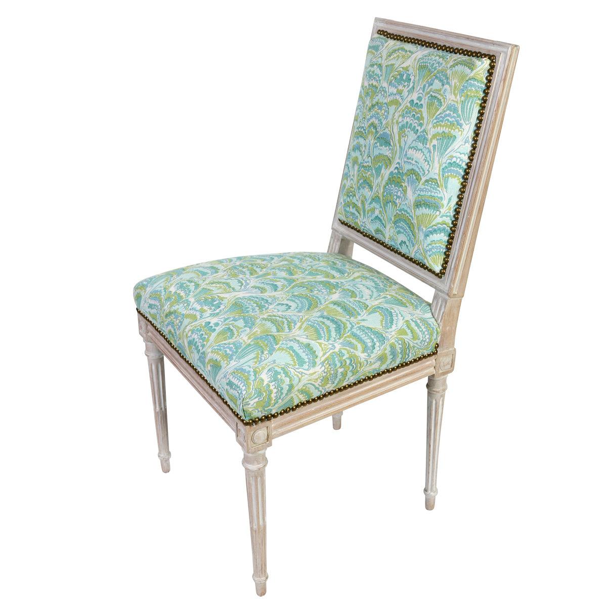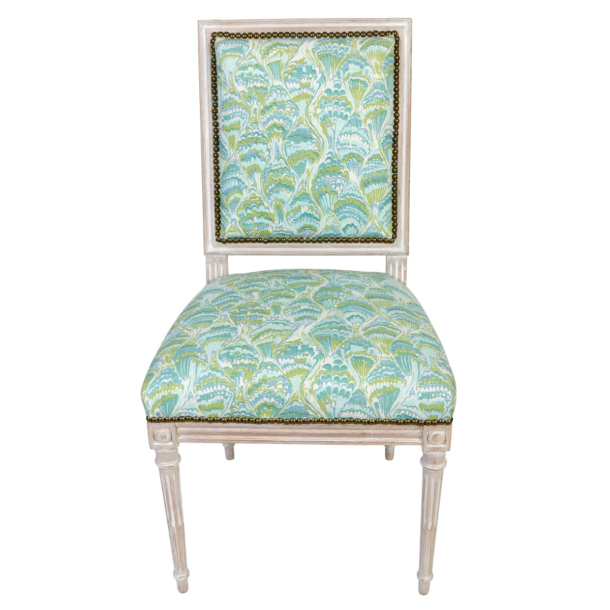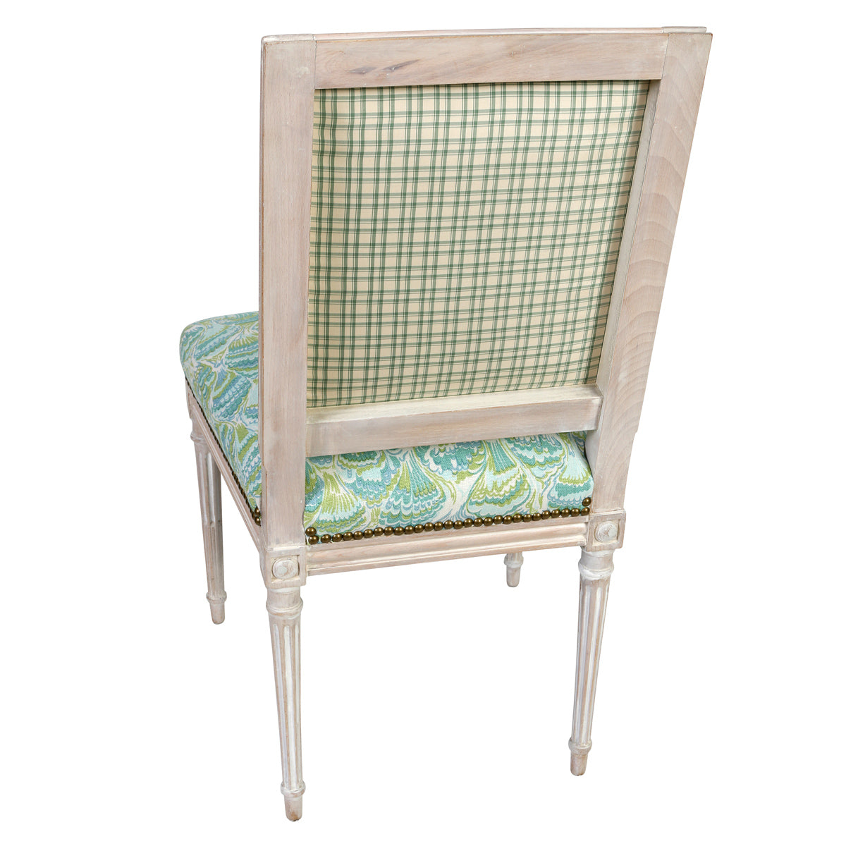 A vintage Jansen style painted square back Louis XVI style side chair with nail head trim newly upholstered in Meg Braff Designs cockleshells fabric in chartreuse and blues and the back upholstered in taffeta silk check. The ribbed and fluted painted chair frame looks fresh and updated with the colorful blue and green fabric.