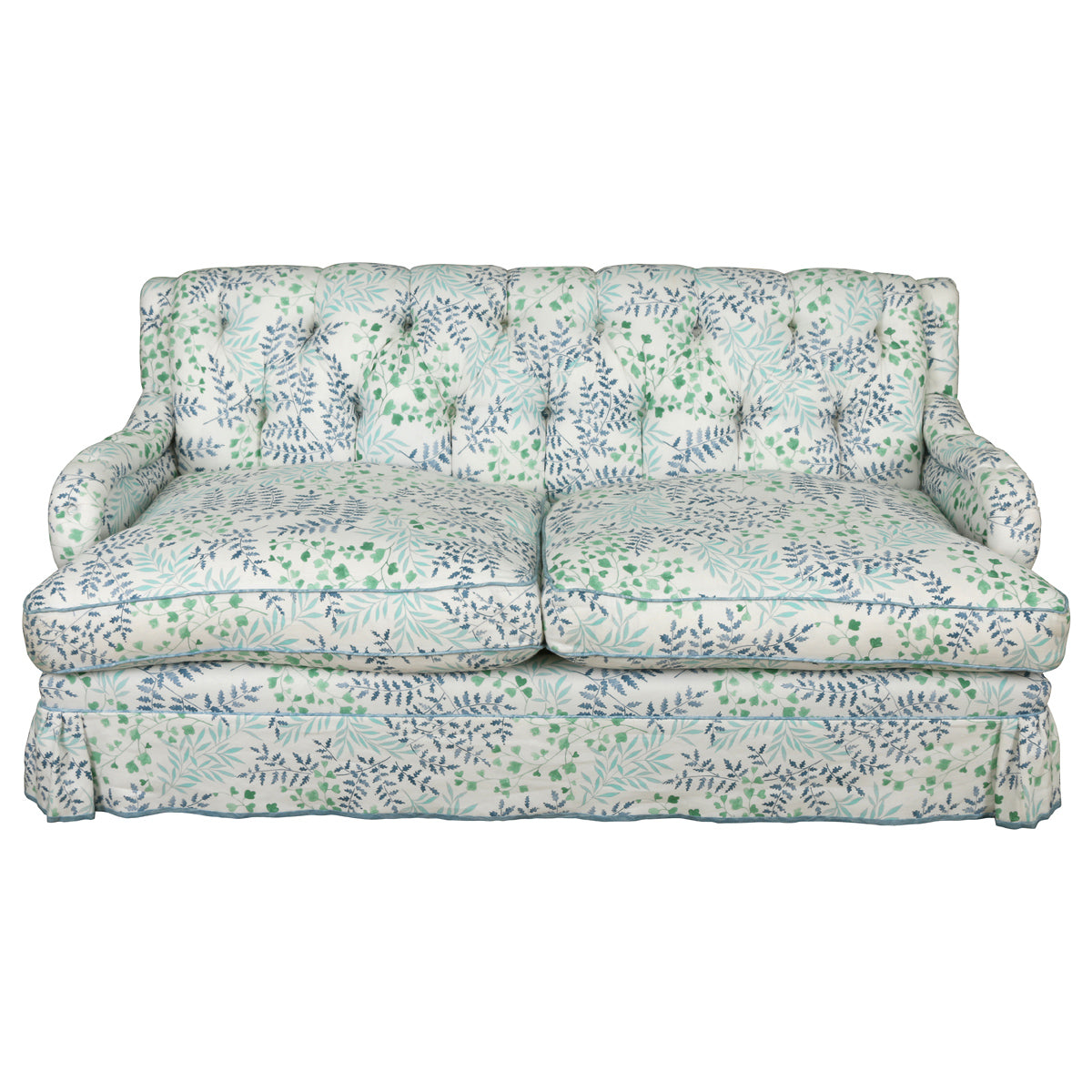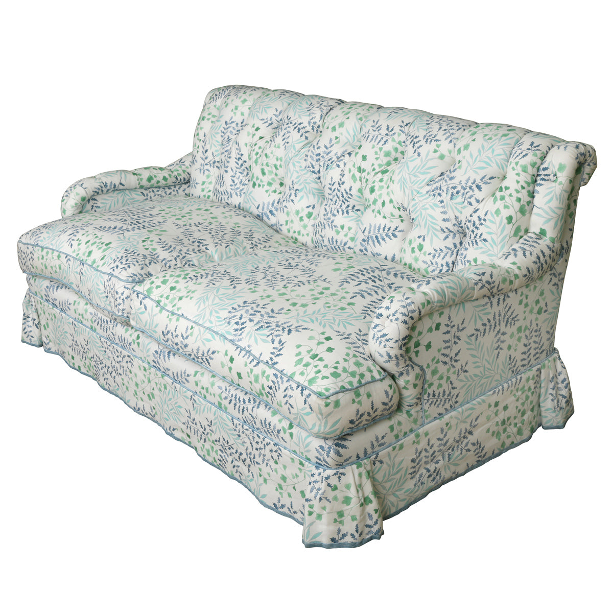 CUSTOM TUFTED ENGLISH LOVESEAT IN KATHRYN IRELAND FABRIC