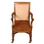 VINTAGE ENGLISH LIBRARY CHAIR WITH UPHOLSTERED LEATHER BACK AND CASTERS
