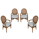 SET OF FOUR MCGUIRE STYLE RATTAN ARM CHAIRS WITH JOHN ROBSHAW CUSTOM BLUE CUSHIONS