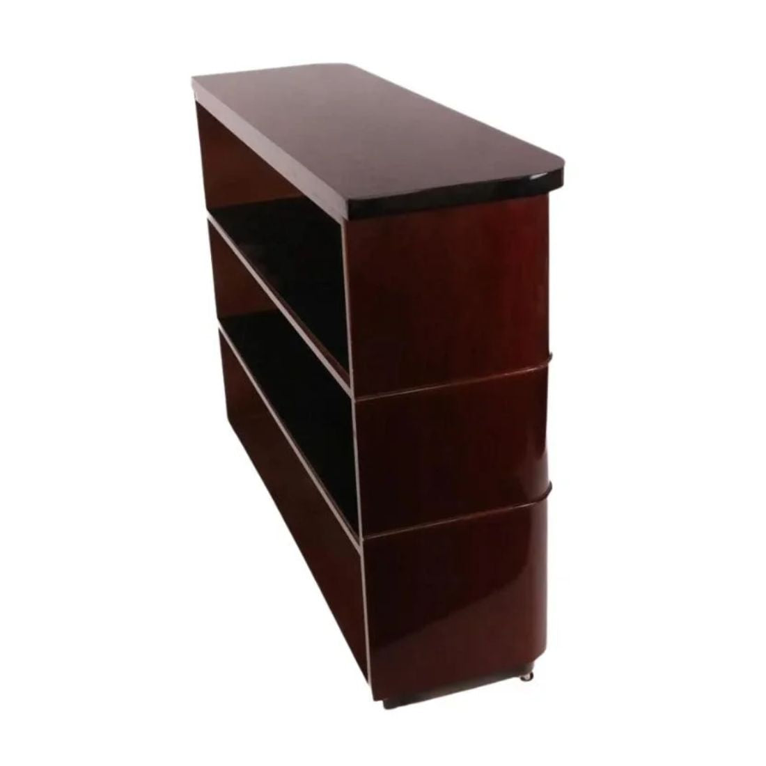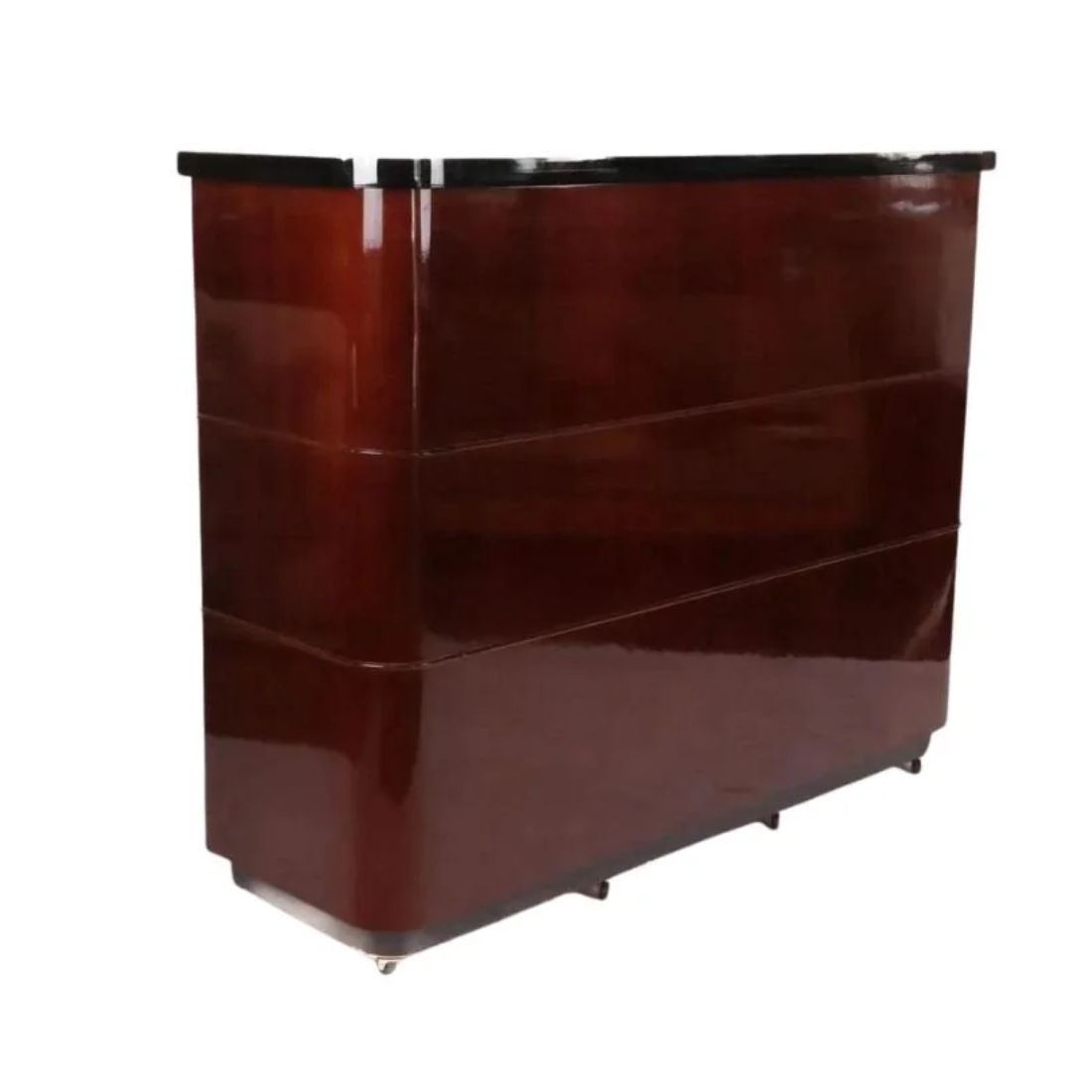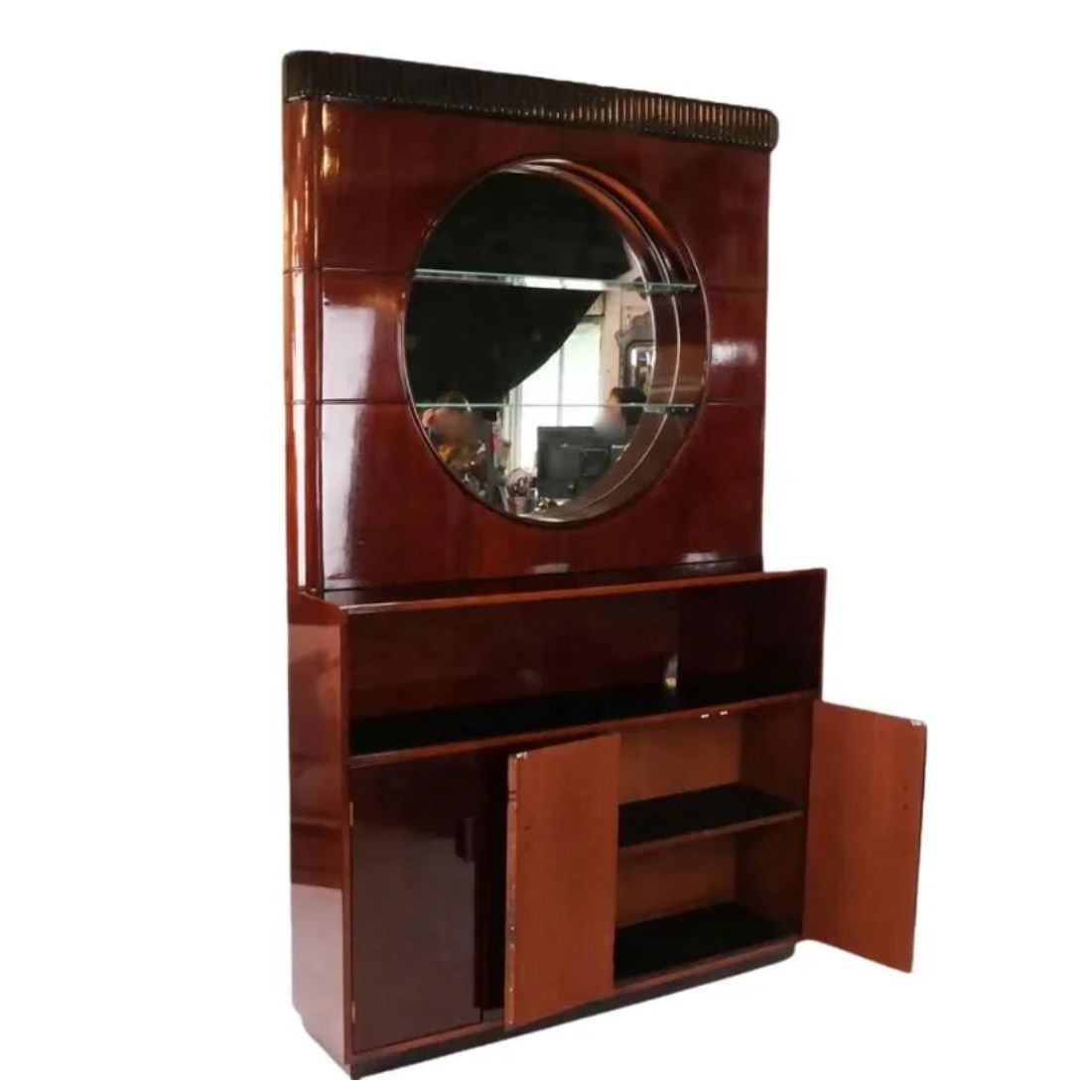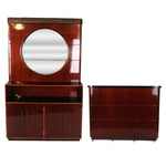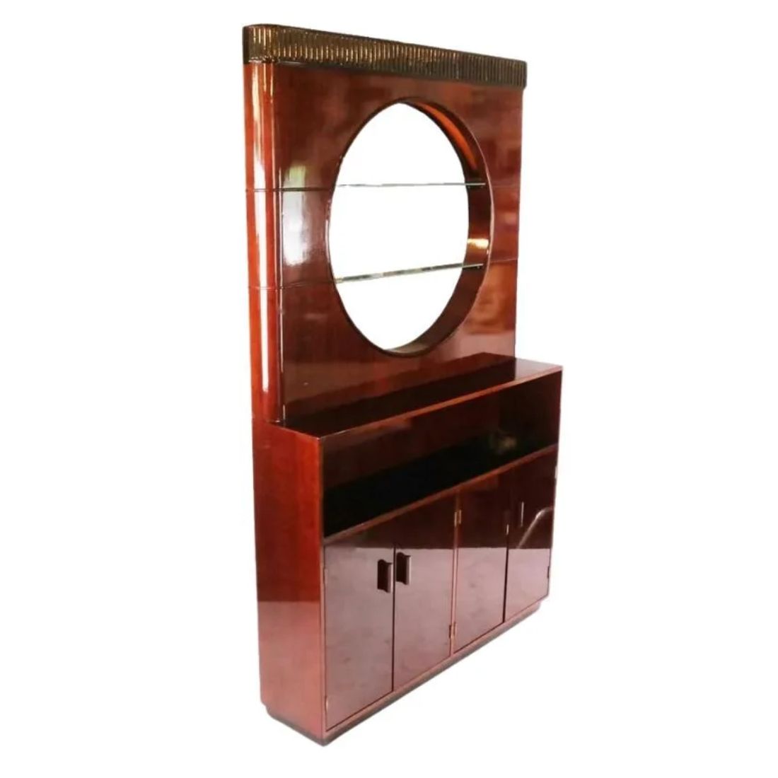 Art Deco style mahogany cabinet and bar suite features a tall display cabinet with round center mirror and shelves, bar storage in a matching base cabinet, and a coordinating freestanding bar, all crafted in a rich, high-gloss lacquered finish that highlights the warm tone and curvature of the design. The architectural silhouette with rounded Art Deco contours is capped with a textured top trim, adding depth and period character. The lacquered finish is highlighted with sleek horizontal paneling. Spacious compartments and shelves offer ample storage for barware, serving pieces, or display items. Together the pieces form a cohesive, sculptural ensemble—perfect for a lounge, dining room, or entertainment space where style and storage merge seamlessly.