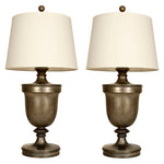 A PAIR OF ANTIQUED SILVER LARGE URN LAMPS