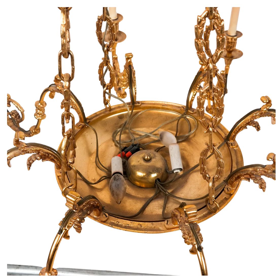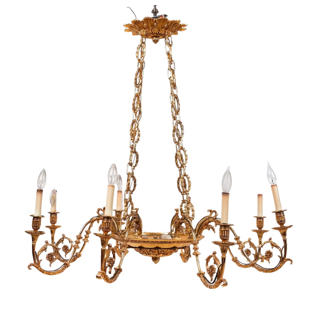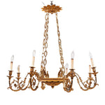 An elegant Louis XVI style gilt bronze chandelier featuring eight scrolling candle-form arms with finely cast acanthus leaves, ribbon, and rosette motifs. The circular central body is richly detailed with neoclassical ornamentation and suspended from elaborate chains of intertwined laurel wreath links terminating in a foliate canopy. Beautifully proportioned and richly gilded, this chandelier embodies the timeless refinement of French neoclassical design—ideal for a formal dining room, entryway, or salon.