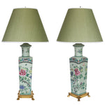 PAIR GREEN CHINOSERIE PORCELAIN LAMPS WITH BRASS FEET