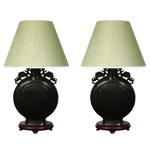 PAIR OF BLACK ASIAN LAMPS WITH FRETWORK