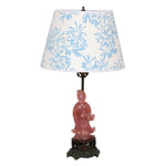 SINGLE CHINESE CARVED ROSE QUARTZ TABLE LAMP WITH ORANTE BRASS AND WOOD BASE
