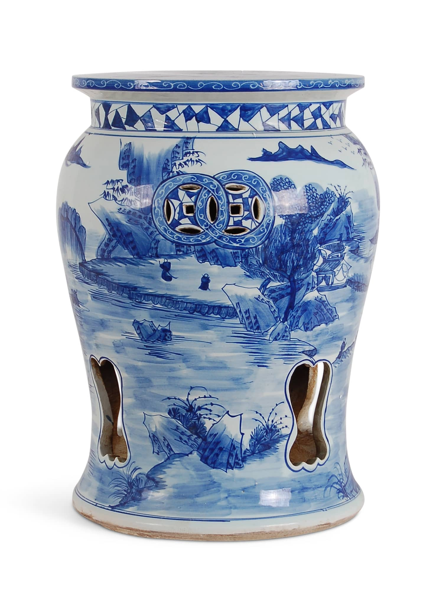 This blue and white porcelain garden stool features a hand-painted landscape scene with mountains, trees, and figures beside a river. Decorative cutouts and intricate geometric borders add texture and depth, blending elegance with traditional Chinese artistry.