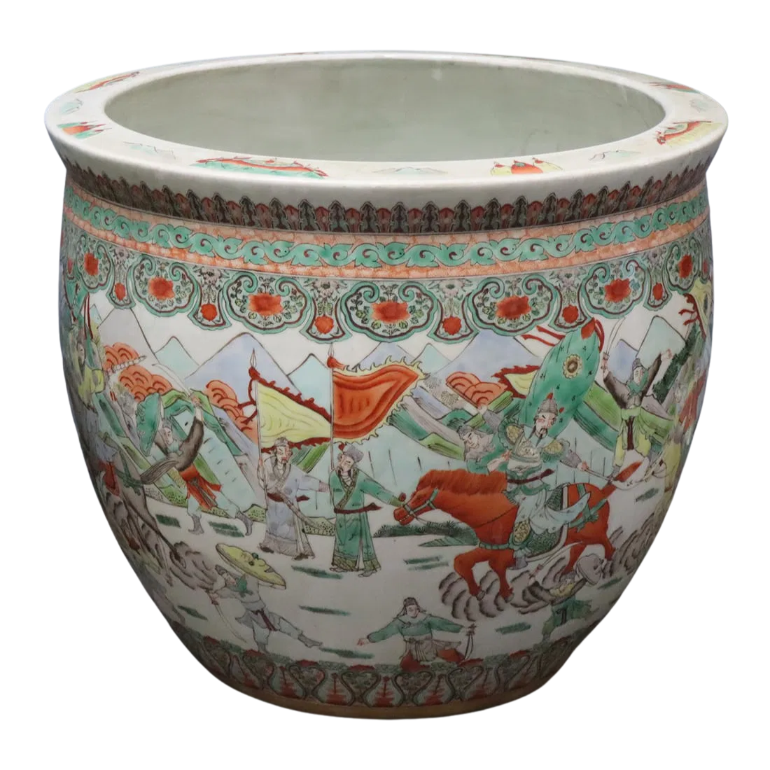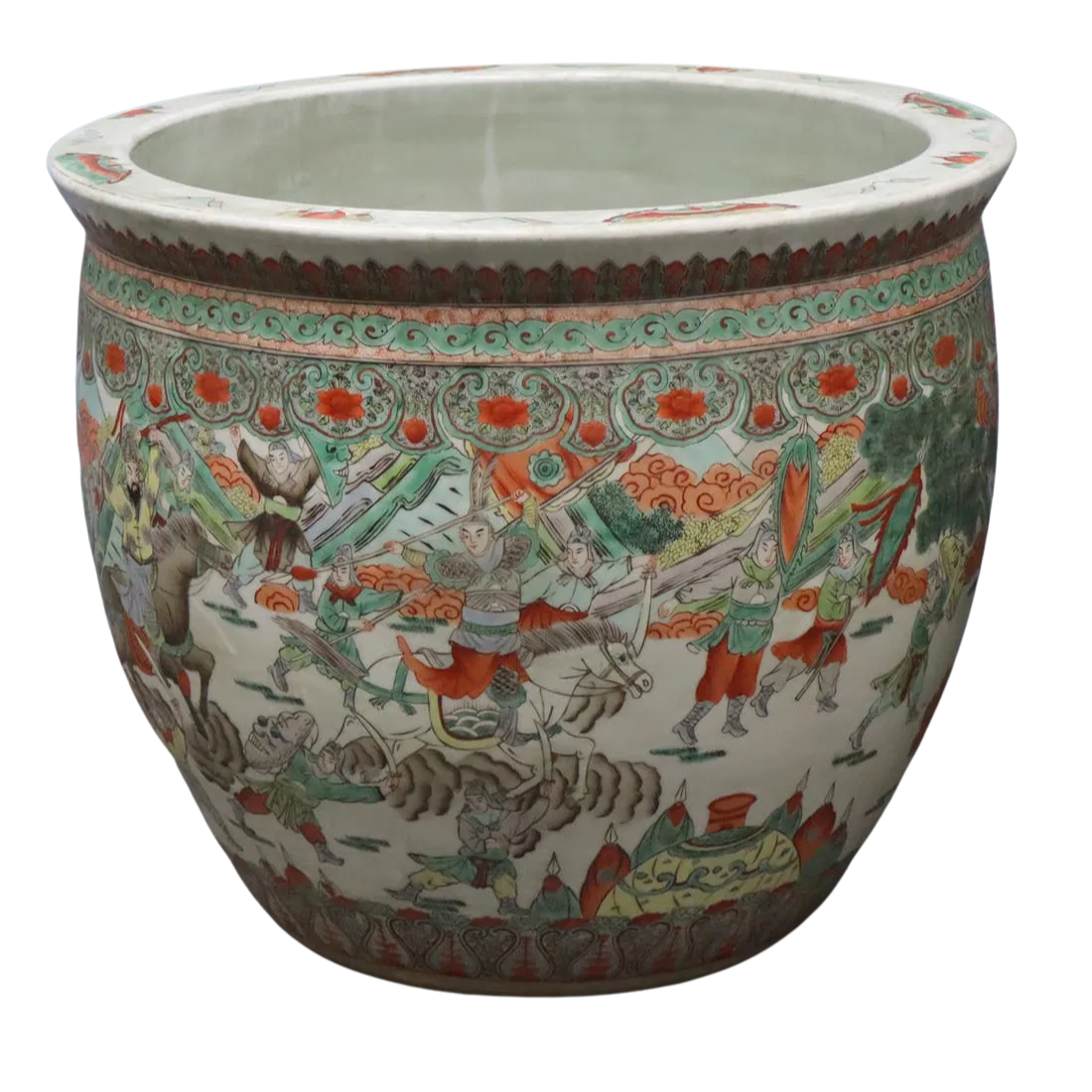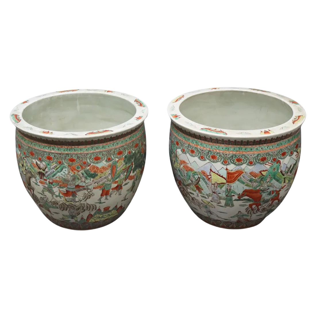 These Chinese Famille Verte fishbowl planters feature richly detailed hand-painted scenes with vibrant figures, landscapes, and traditional motifs in classic green, red, and ochre tones. Their generous scale and intricate decoration make them striking statement pieces for indoor plants or decorative display.