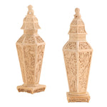 A pair of large, intricately carved and painted Asian wood urns topped with Foo dogs feature a distinctive hexagonal shape, adding a unique geometric flair to their traditional design. The body of each urn is adorned with detailed hand-carved elaborate patterns and symbols that reflect traditional Asian artistry. Atop each urn, the removable lid is topped with a finely sculpted Foo dog, a symbol of protection and strength. The urns sit gracefully on small square pedestals, elevating their presence and enhancing their elegance.