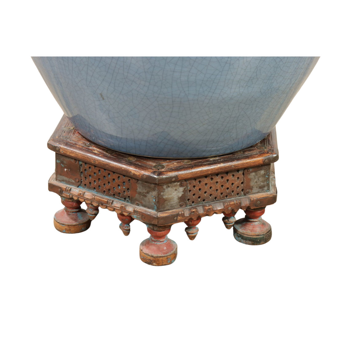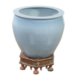 LARGE PALE BLUE JARDINERE ON CARVED WOOD STAND