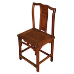 Pair of vintage Asian chairs with vertical center back support and carved with square motif. Seat is square and stretcher is square as well.