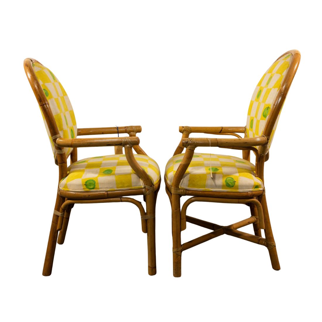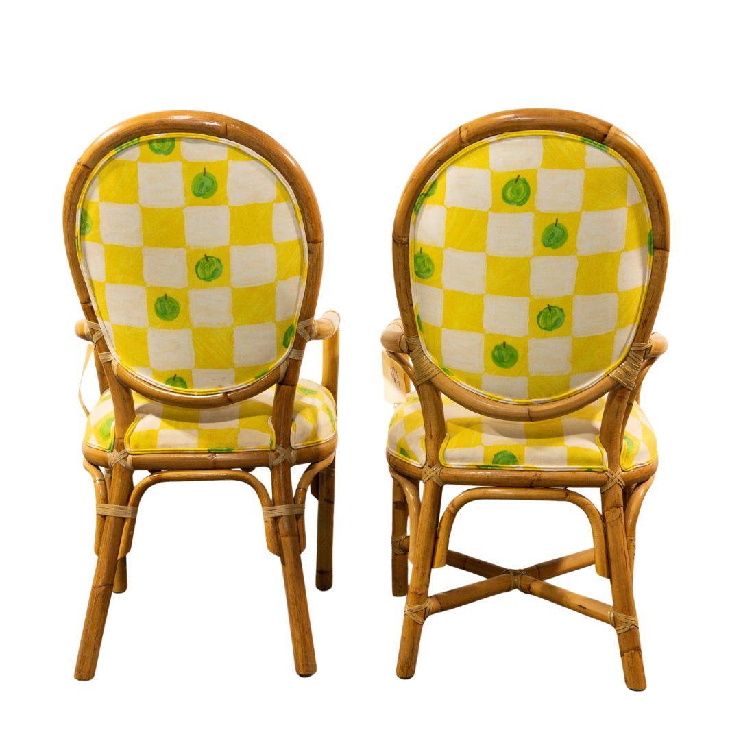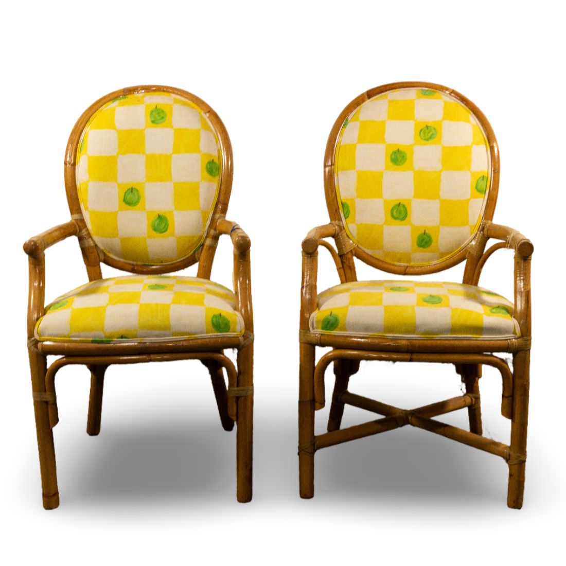 VINTAGE PAIR OF WALTERS WICKER INDOOR RATTAN CHAIRS WITH UPHOLSTERY
